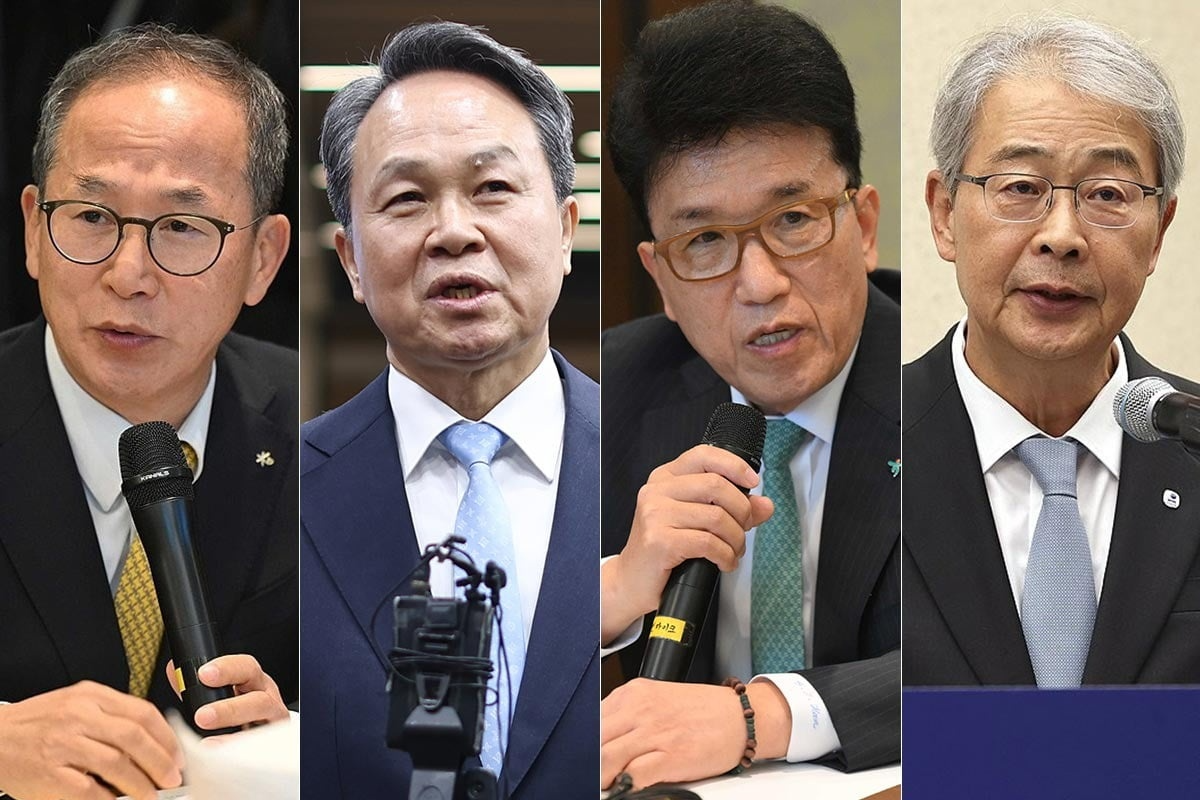 The heads of Korea’s four major financial groups, from left: KB Financial Group Chairman Yang Jong-hee, Shinhan Financial Group Chairman Jin Ok-dong, Hana Financial Group Chairman Ham Young-joo, and Woori Financial Group Chairman Yim Jong-yong.