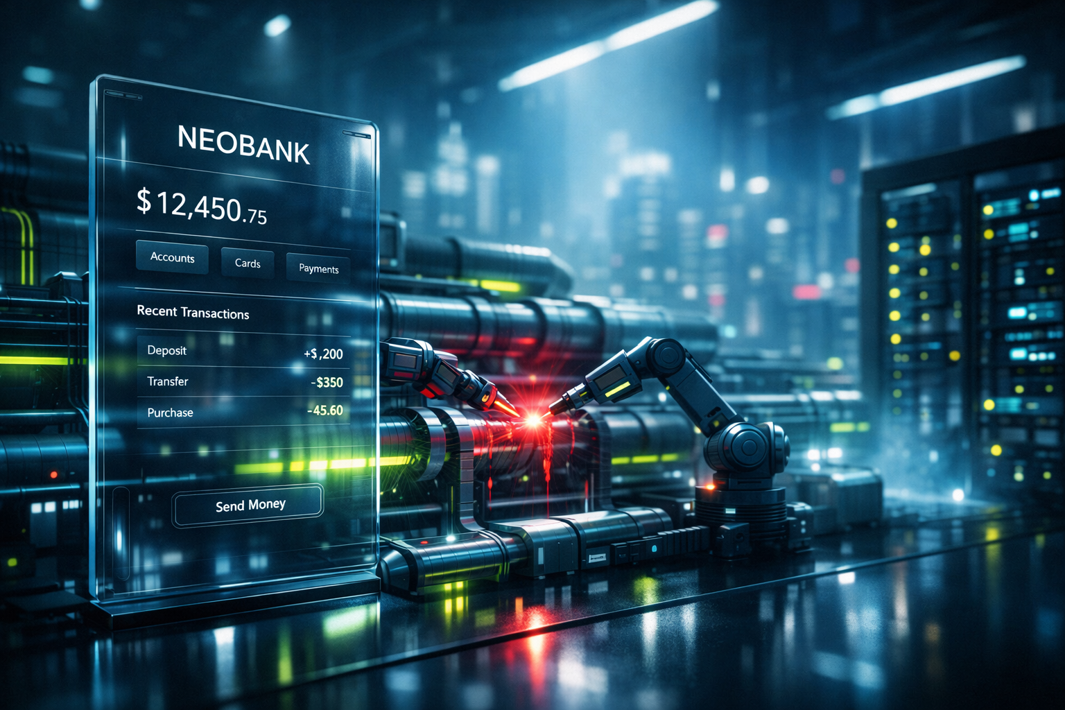 Futuristic digital banking interface representing neobank technology and backend automation for profitability